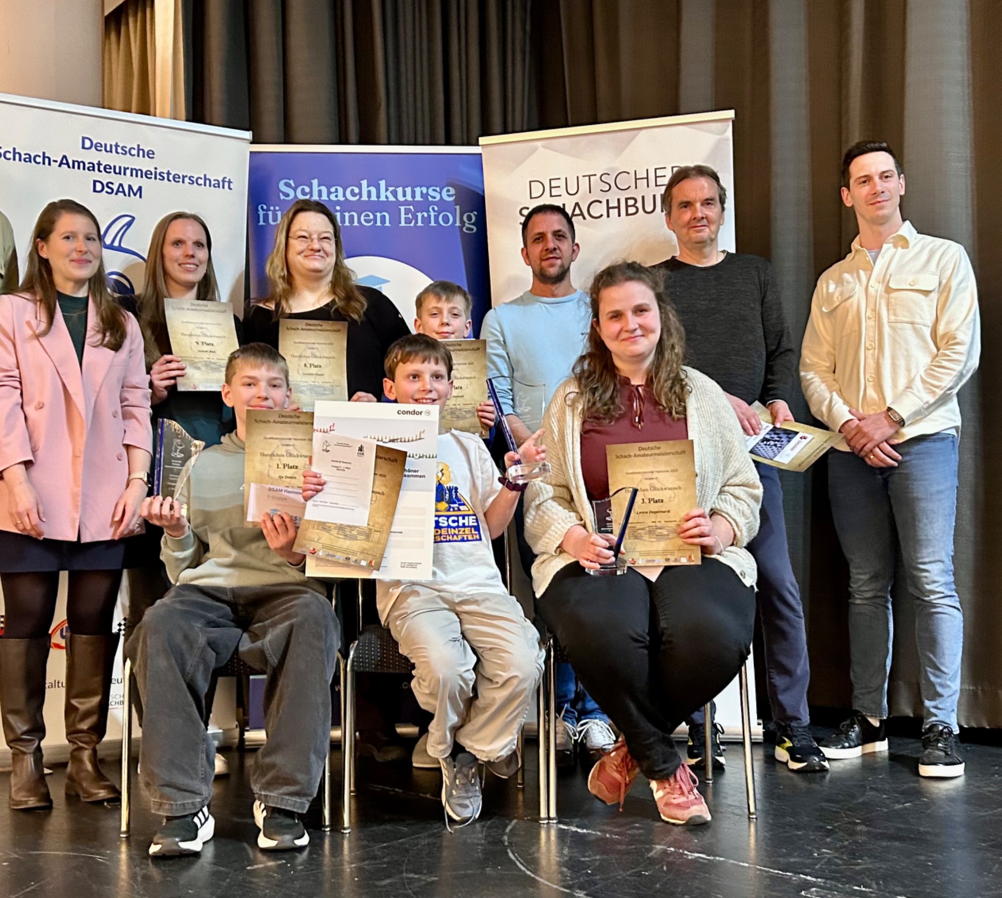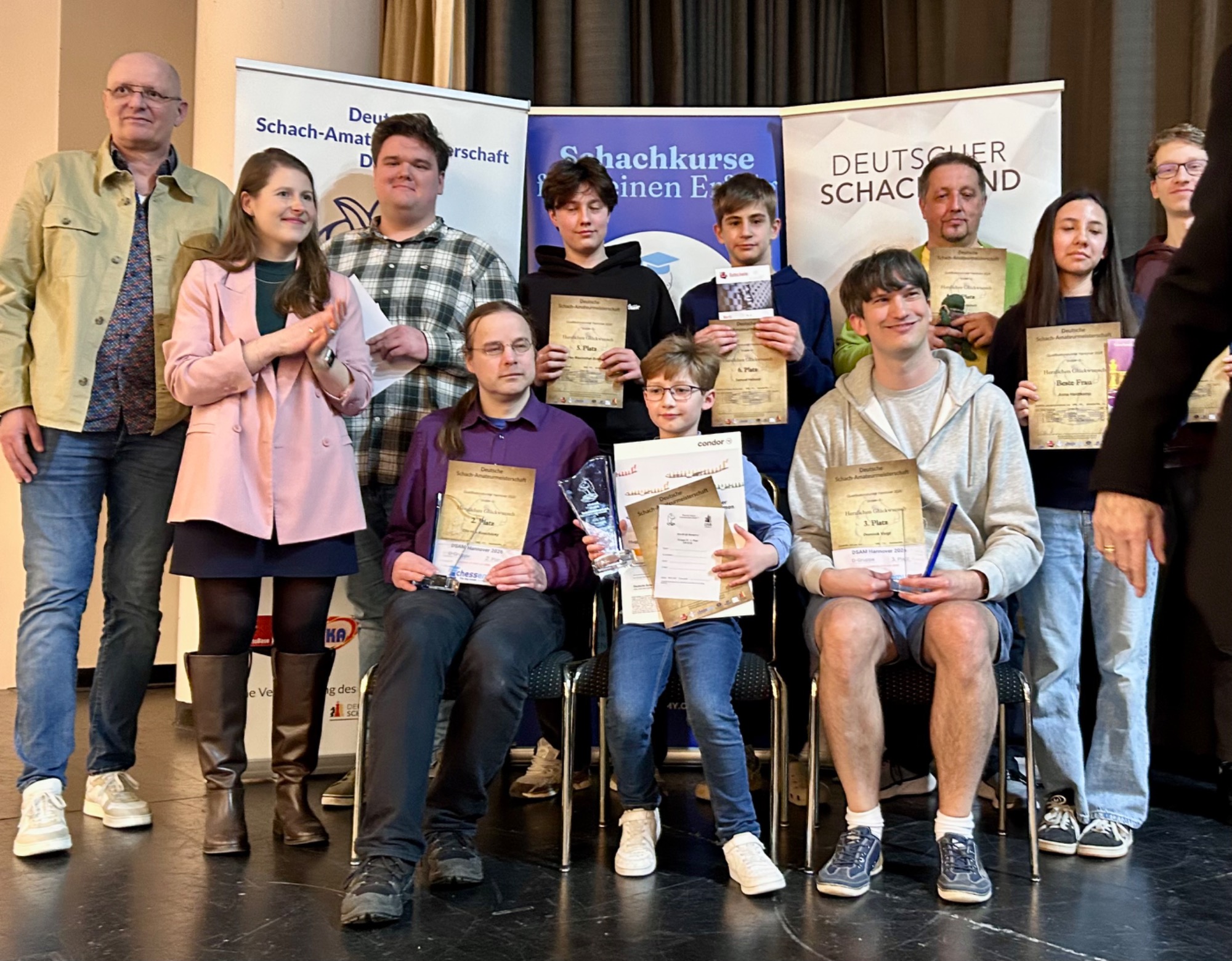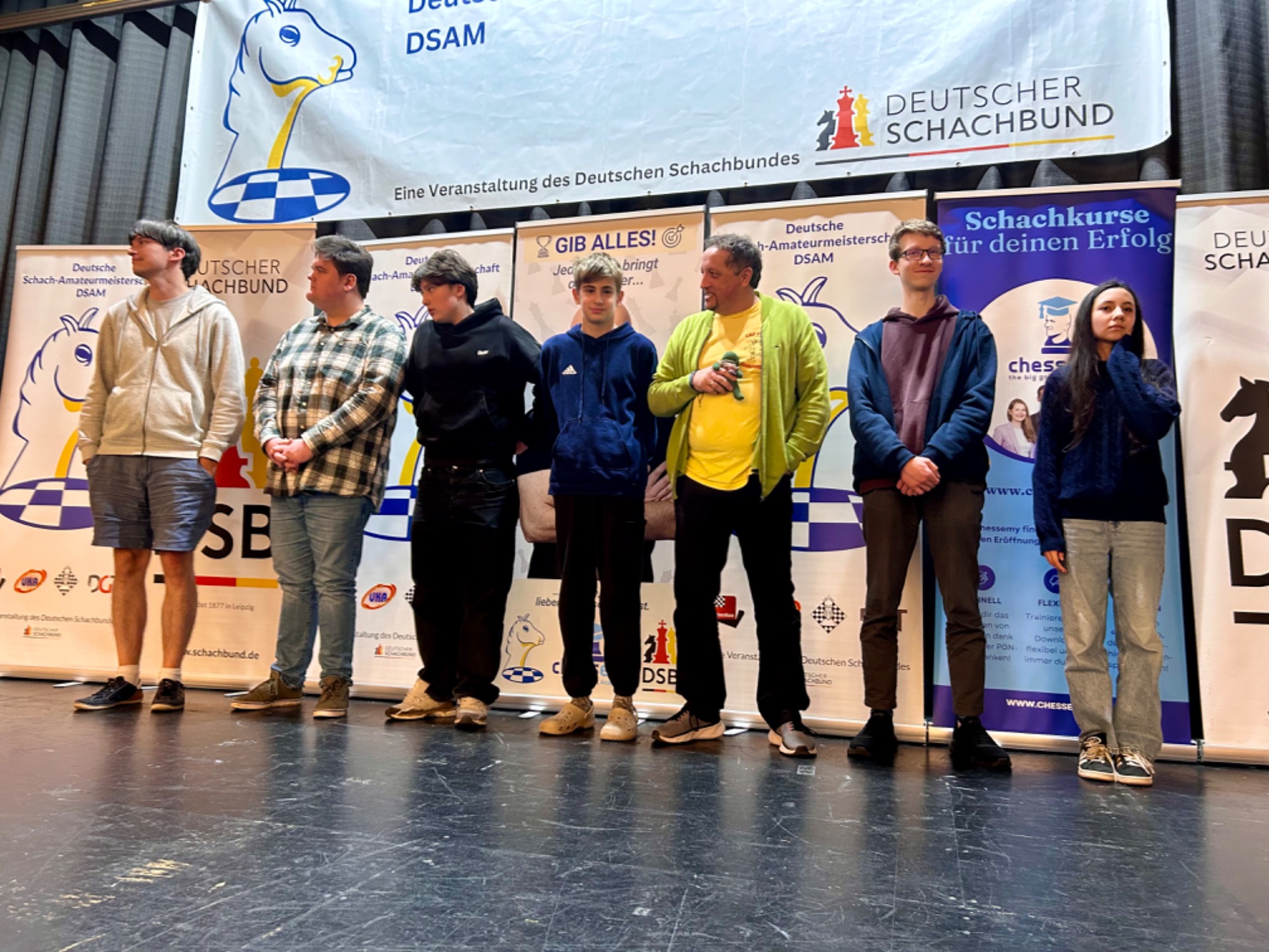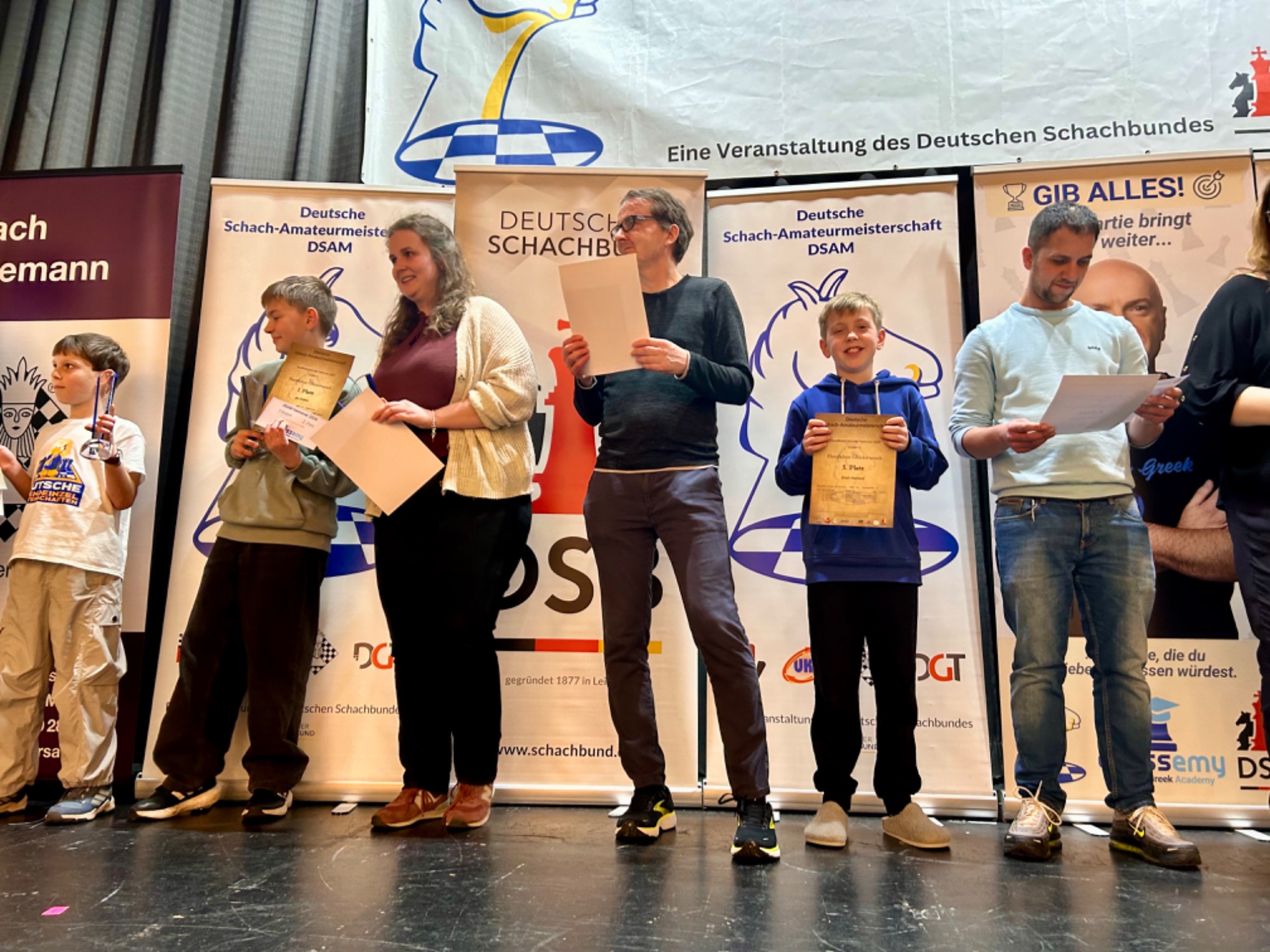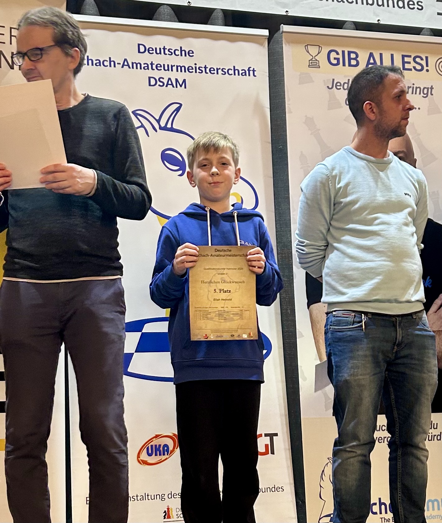 Auch Sami schaffte es erneut, sich zu qualifizieren, und durfte als Sechstplazierter in der Gruppe D immerhin auch noch mit auf die Bühne. Für Martin reichte es leider nicht, aber mit 2.5 aus 5 Punkten kann sich der Schachanfänger, der nur leidlich von seinen Kindern gecoacht wird, doch durchaus sehen lassen!