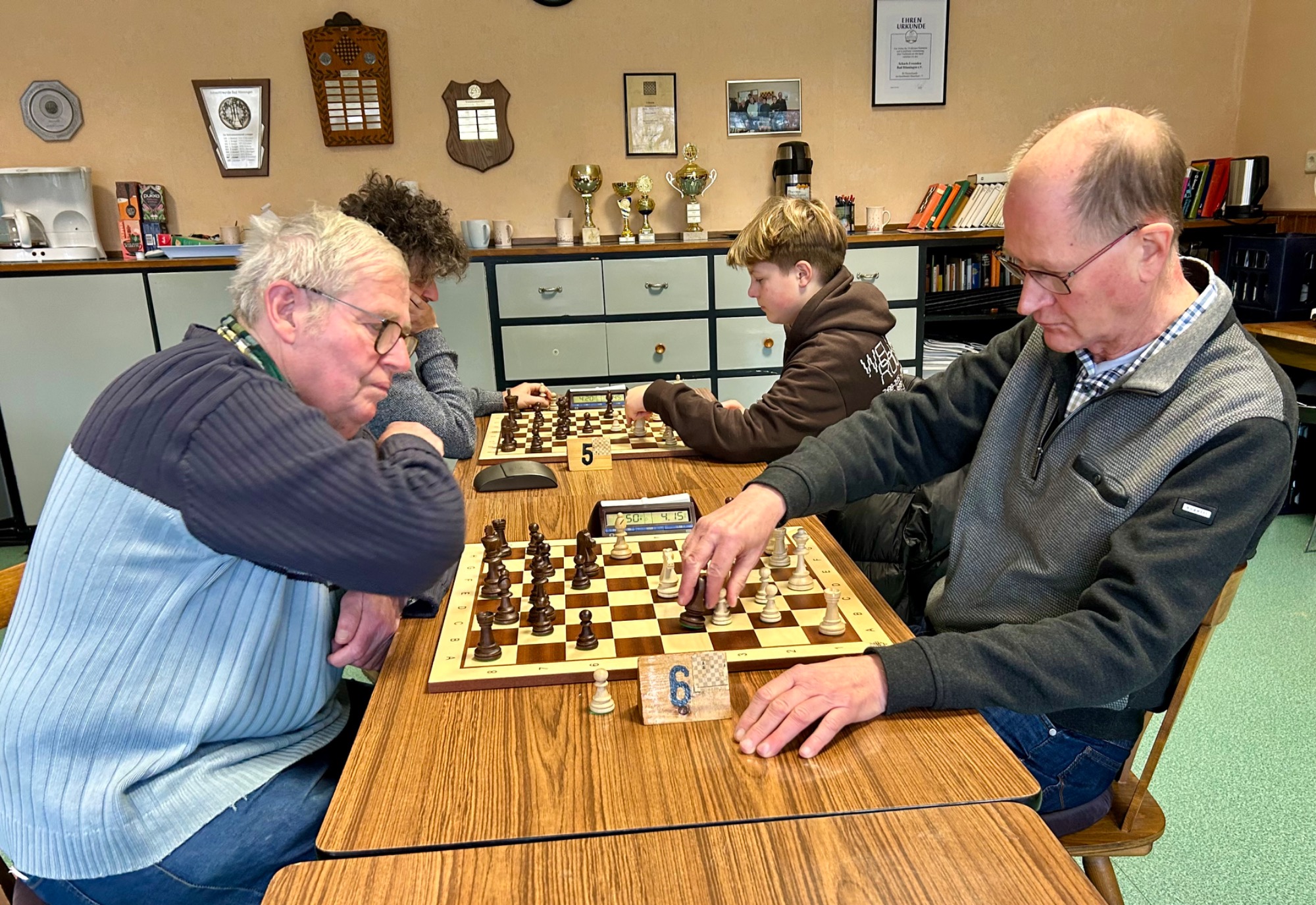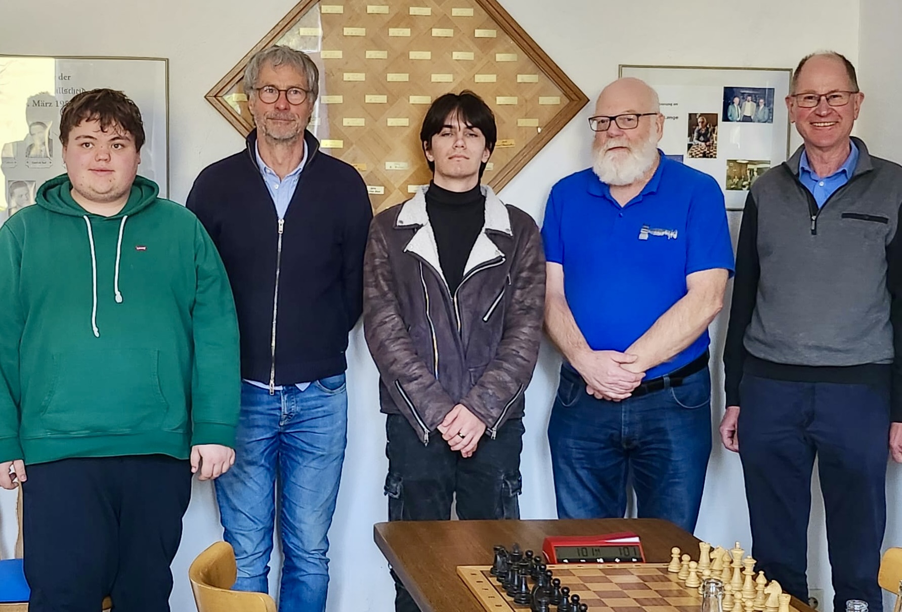 Unsere Gewinner der Bezirksmeisterschaft 2026 des SBRW im Schnellschach: Thomas Lenz (in blau) landete auf dem 1. Platz, und Günther Klein (ganz rechts, und wie gewohnt und zurecht guter Dinge) schaffte es auf den 2. Platz. Von links teilten sich den 3. Platz: Ben Dehren, Werner Saal & Yevhenii Dotsenko. Glückwünsche an alle, und vielen Dank an Inge Best für die Fotos!