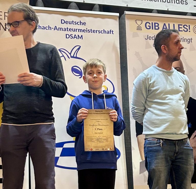 Nach drei anstrengenden Spieltagen im netten Ambiente des Maritim Hotels hatte es Eli geschafft, ganze 4 von 5 Punkten zu erspielen, womit er auf dem 5. Platz in der Gruppe F landete und sich auf Anhieb bei seiner ersten DSAM für das Finale im Juli in Dresden qualifiziert hat! Wir gratulieren natürlich auch ihm!